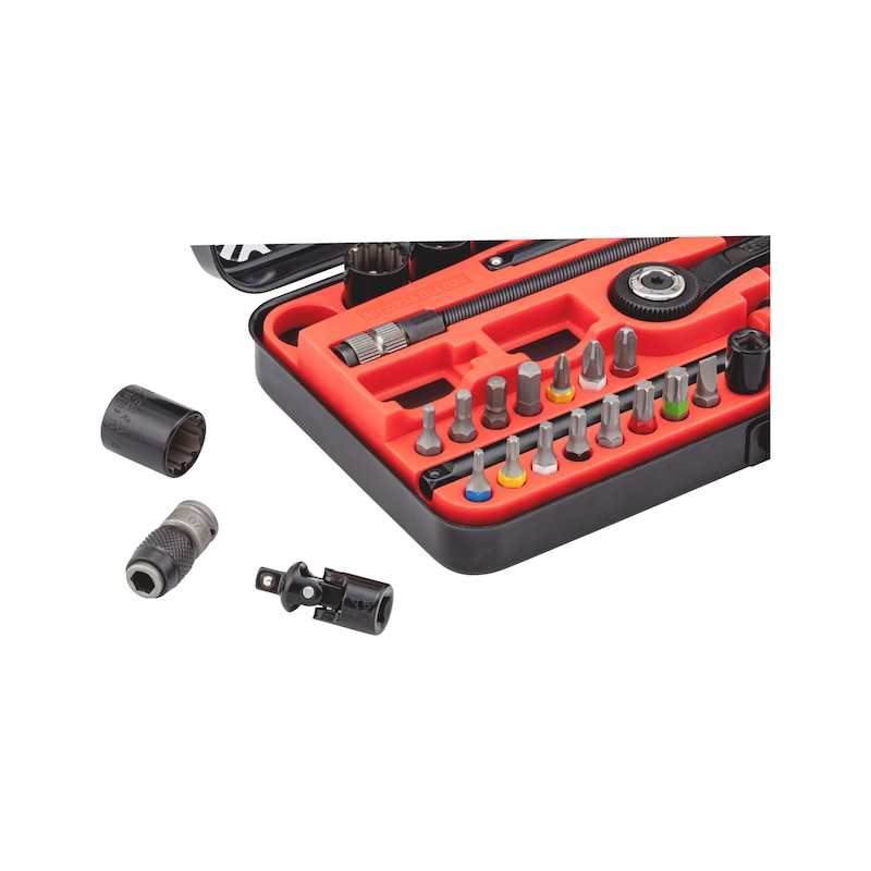 Die robuste Metallkassette ist mit einer modernen 2-Komponenten-Werkzeugeinlage ausgestattet. Diese sorgt durch Klemmeffekt für sicheren Halt aller Teile und hohe Langlebigkeit. Die schwarz verchromte Oberfläche verleiht dem Werkzeug ein edles Erscheinungsbild und bietet gleichzeitig sehr guten Korrosionsschutz.